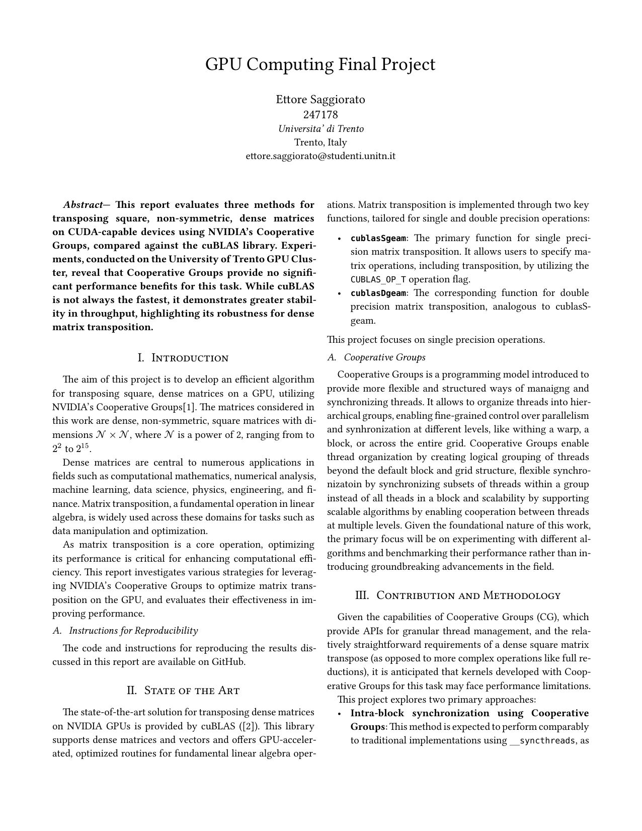 Develop some algorithms to transpose the matrix in GPU, using NVIDIA’s Cooperative Groups. Compare the results against cuBLAS. This wasn’t straightforward as Cooperative Groups are not a good idea for dense matrix transposition, so I had to work against all the things that were studied during the course. Three algorithms were developed (ignoring copy):